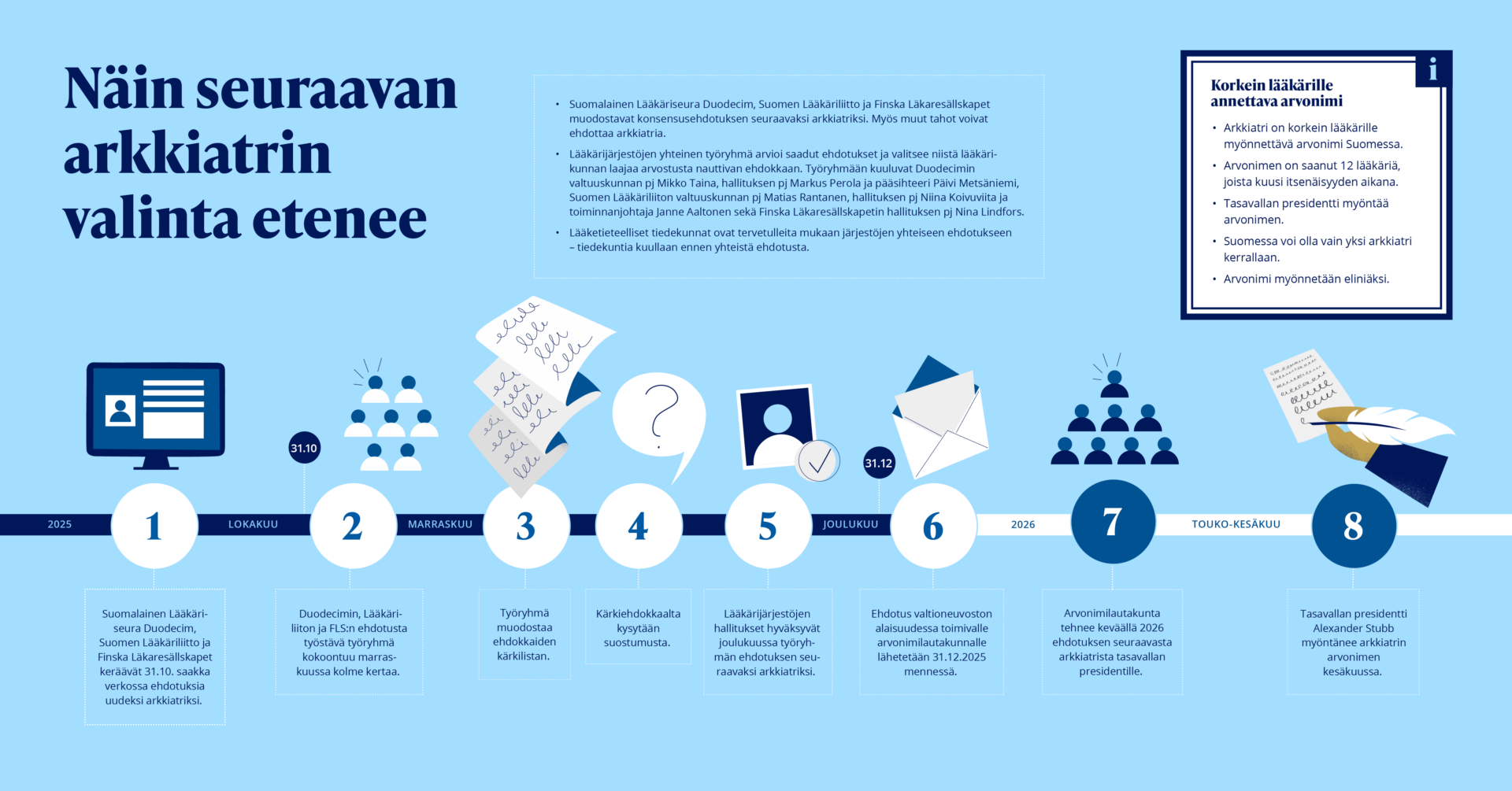 Ajankohtaista Arkkiatrin valinta on lääkärikunnan yhteinen ponnistus Blogi 9. lokakuuta 2025 Arkkiatrin valinta on lääkärikunnan yhteinen ponnistus Jaa Jaa sosiaalisessa mediassa Arkkiatrin arvonimi on kunnianosoitus sivistykselle, tiedolle, lääkärin eettiselle vastuulle ja arvoille, joiden varaan suomalainen terveydenhuolto rakentuu. Arkkiatri on enemmän kuin yksittäinen henkilö: hän on perinteen ja tulevaisuuden yhdistäjä, koko lääkärikunnan yhteinen ääni. Arkkiatri on suomalaisessa lääkärikunnassa ainutlaatuinen instituutio, arvonimi, joka on niin syvästi historiallinen kuin vahvasti symbolinenkin. Nimi juontaa juurensa antiikkiin ja on tuhansia vuosia vanha, arvostetun lääkärin arvonimi, usein kollegakunnan johtava lääkäri tai hallitsijan henkilääkäri. Suomessa ensimmäinen arkkiatri nimitettiin vuonna 1817, ja tähän mennessä arvonimi on myönnetty kahdelletoista lääkärille. Nykyään nimike on käytössä tiettävästi vain Suomessa ja Vatikaanissa, jossa archiater on paavin henkilääkäri. Miten arkkiatri nimitetään Arvonimen myöntää tasavallan presidentti arvonimilautakunnan esityksestä. Arvonimien kantajan tulee arvonimilautakunnan määritelmän mukaan olla ”erityisen ansioitunut, hyvämaineinen ja nuhteeton sekä soveltua esitetyn arvonimen saajaksi”. Arkkiatrilta odotettaneen, että hän puolustaa eettisiä periaatteita, tutkimuksen vapautta ja ihmisoikeuksia. Ehdotuksia voivat tehdä niin viranomaiset, yhdistykset kuin yksittäiset kansalaisetkin. Pitkän uran tehneet arkkiatrit ovat luoneet esimerkillään merkittävän roolin Etenkin Arvo Ylpön ja Risto Pelkosen kaltaiset, pitkän uran tehneet arkkiatrit ovat rakentaneet esimerkillään lääkärikunnan vanhimman roolin, jossa yhdistyvät niin tutkittu tieto, humaani potilastyö kuin rohkea ääni yhteiskunnallisessa keskustelussakin. Arkkiatri muistuttaa esimerkillään, ettei lääkärin työ ole vain diagnostiikkaa ja hoitoa vaan myös ihmisen rinnalla kulkemista. Arvonimen olemassaolo kertoo myös yhteiskunnan arvostuksesta lääketiedettä kohtaan sekä arkkiatrin roolista yhdyssiteenä lääkärikunnan ja kansalaisten välillä. Mikä on lääkärijärjestöjen rooli? Lääkärijärjestöt, Suomen Lääkäriliitto, Duodecim ja Finska Läkaresällskapet, jatkavat perinnettä, jossa seuraavaa arkkiatria ehdotetaan yhteisvoimin. Tavoitteena on löytää ehdokas, joka nauttii kollegion laajaa luottamusta ja arvostusta – henkilö, jonka merkitys ulottuu sekä lääketieteeseen että yhteiskuntaan. Olemme avanneet avoimen ehdokaskyselyn, jonka kautta kuka tahansa voi esittää henkilöä harkittavaksi. Ehdokkaan valintaa varten lääkärijärjestöt ovat muodostaneet ydinryhmän, jossa on seitsemän edustajaa. Tämä ydinryhmä käy läpi ehdokkaat, kuulee asiasta tiedekuntia ja lopulta kokoaa ehdotuksen, jonka järjestöjen hallitukset arvioivat kukin tahollaan. Kärkiehdokkaan suostuttua tehtävään esitetään ehdokasta arvonimilautakunnalle, joka tekee oman työnsä ehdokkaan taustojen selvittämiseksi. Lopullinen nimitys on presidentin päätettävissä. Aikaisintaan maassamme on uusi arkkiatri todennäköisesti vasta 2026 kesällä. Arkkiatri yhdistää perinteen ja tuleva Arkkiatrin arvonimi ei suo hallinnollista valtaa, mutta sen symbolinen voima ja vaikutusvalta on suuri. Se on kunnianosoitus sivistykselle, tiedolle, lääkärin eettiselle vastuulle ja arvoille, joiden varaan suomalainen terveydenhuolto rakentuu. Arkkiatri on enemmän kuin yksittäinen henkilö: hän on perinteen ja tulevaisuuden yhdistäjä, koko lääkärikunnan yhteinen ääni. Arvonimilautakunnalle suositeltavan arkkiatriehdokkaan valinta ei ole helppo eikä yksinkertainen prosessi, mutta haasteisiin me lääkärit olemme tottuneet. Lääkärijärjestöjen edustajina lähdemme prosessiin rauhallisella, mutta päättäväisellä otteella: tavoitteenamme on hoitaa tämä tärkeä tehtävä huolellisesti ja hyvässä yhteishengessä.Näin seuraavan arkkiatrin valinta etenee. Klikkaamalla saat kuvaa suuremmaksi. Blogin kirjoittajat:Niina Koivuviita on Suomen Lääkäriliiton hallituksen puheenjohtaja, Nina Lindfors Finska Läkaresällskapetin hallituksen puheenjohtaja ja Markus Perola Suomalaisen Lääkäriseura Duodecimin hallituksen puheenjohtaja. Valet av arkiater ett gemensamt val av läkarkåren Titeln arkiater är en hyllning till civilisationen, kunskapen, till läkarens etiska ansvar och till de värderingar som den finska hälso- och sjukvården bygger på. En arkiater är mer än en individ: han eller hon är en länk mellan traditioner och framtid, en gemensam röst för hela läkarkåren. Arkiatern är en unik institution inom den finska läkarkåren, en titel som är både historisk och starkt symbolisk. Namnet går tillbaka till antiken och är tusentals år gammalt, en titel på en respekterad läkare, ofta den ledande läkaren i en jämnårig grupp eller en monarks personliga läkare. I Finland utsågs den första arkiatern 1817 och sedan dess har titeln beviljats tolv läkare. Idag används titeln som känt endast i Finland och Vatikanen, där en archiater är påvens personliga läkare. Hur utses arkiatern? Titeln beviljas av republikens president på förslag av titelnämnden. Enligt titelnämndens definition ska titelbäraren vara ”särskilt framstående, ansedd och klanderfri samt lämplig att motta den tilldelade titeln”. Arkiatern förväntas försvara etiska principer, forskningsfrihet och mänskliga rättigheter. Förslag kan lämnas in av myndigheter, föreningar och enskilda medborgare. Långtids arkiatrer har statuerat betydande exempel Särskilt personer som Arvo Ylppö och Risto Pelkonen har under sina långa karriärer som arkiater och genom sina exempel byggt upp läkaryrkets äldsta roll, där forskning och kunskap kombineras med humant patientarbete och en modig röst i samhällsdebatten. Genom sitt exempel påminner arkiatern oss om att en läkares arbete i